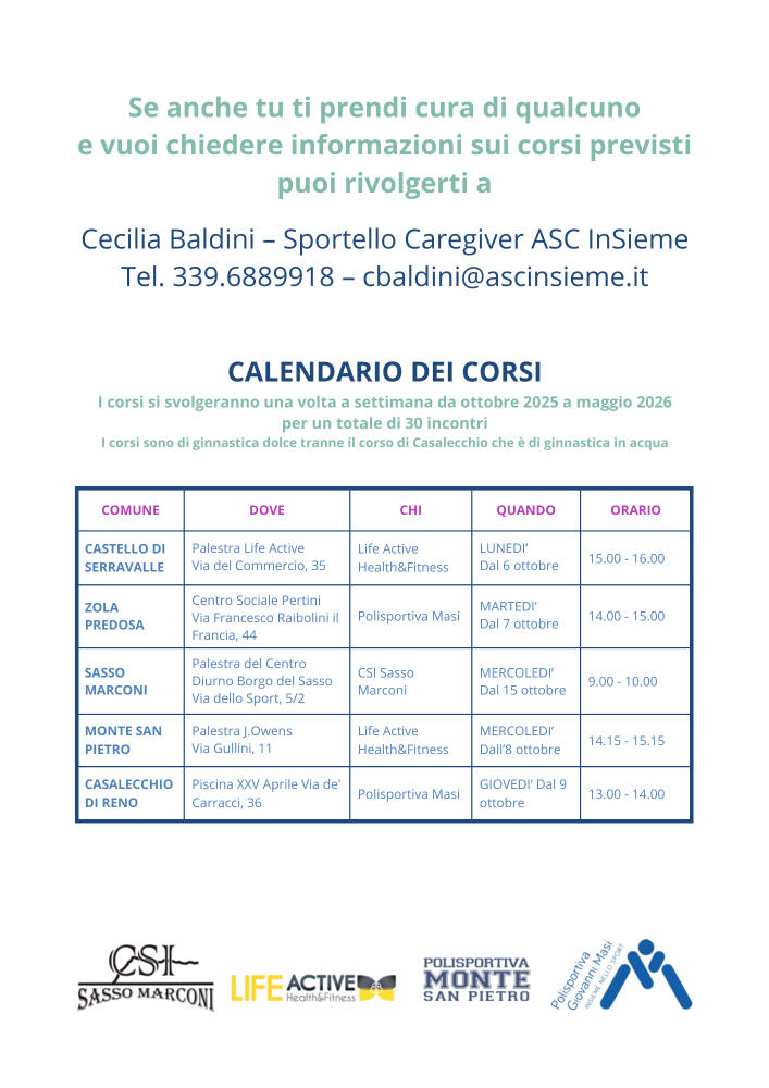 Se anche tu ti prendi cura di qualcuno e vuoi ridurre il senso di fatica, di ansia e di solitudine puoi chiedere informazioni sui corsi previsti rivolgendoti a: Cecilia Baldini – Sportello Caregiver ASC InSieme: 3396889918 cbaldini@ascinsieme.it